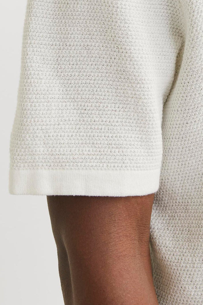 This knit polo shirt features a regular fit with short sleeves and a classic button fastening at the polo neckline. Its light, comfortable fabric blend combines organic cotton, recycled cotton, and recycled polyester, offering a sustainable choice with a soft touch and flexibility. The color "Cloud dancer" adds a subtle and versatile tone, perfect for casual wear throughout the spring season.