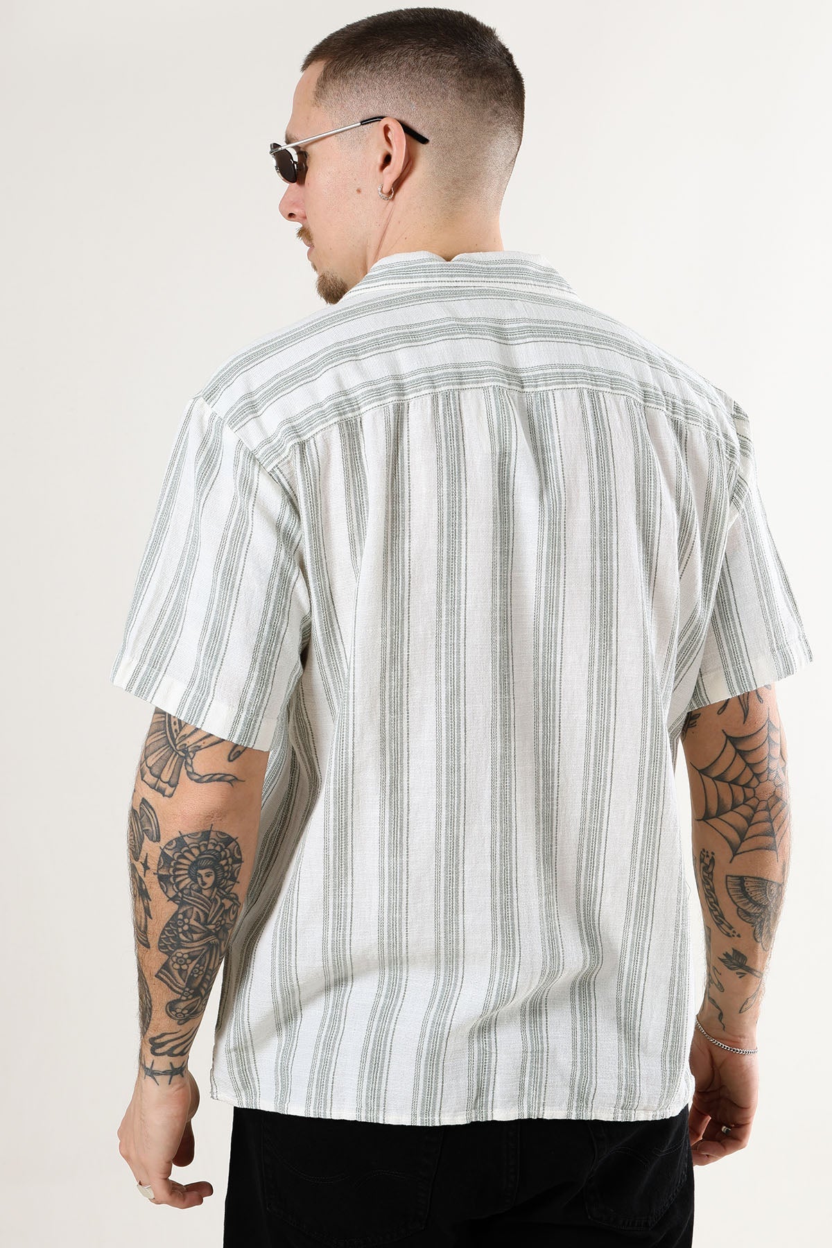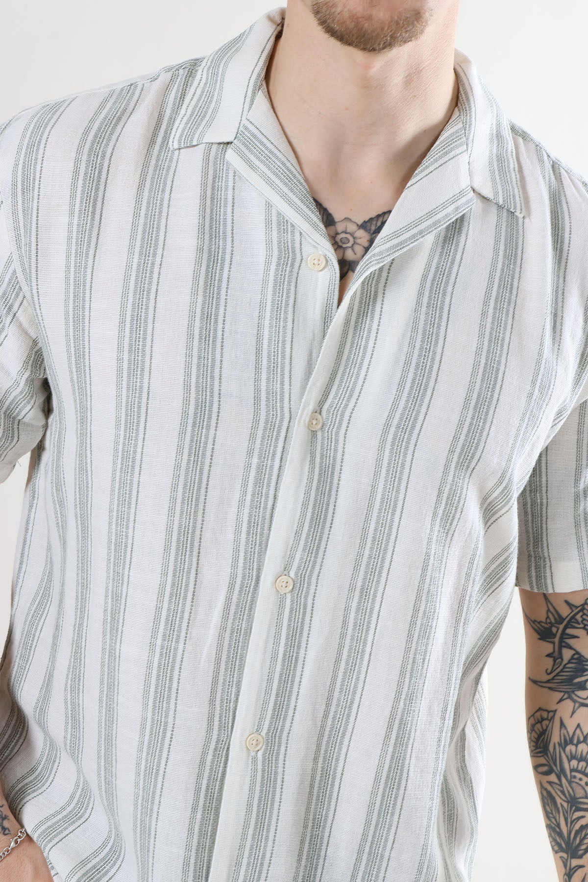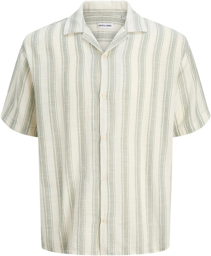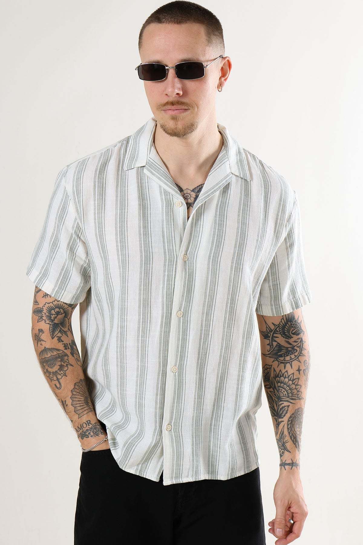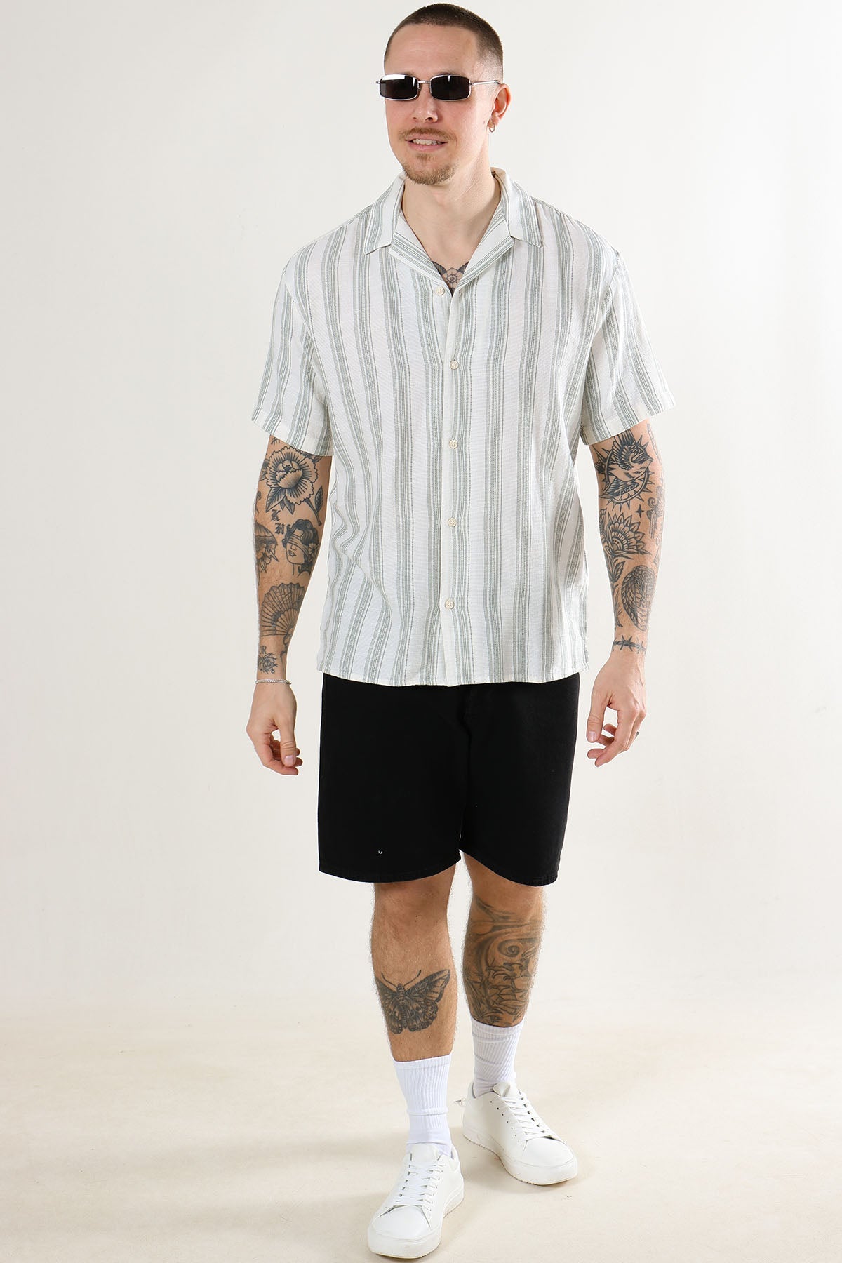 This relaxed fit resort shirt features a light and airy design perfect for a stylish summer outfit. The short sleeves and resort collar add to its casual and comfortable vibe. Made from a woven fabric, it offers strength and durability without the stretchiness of knitted materials. The shirt comes in a soft "Cloud Dancer" striped pattern, lending a subtle and fresh look.
