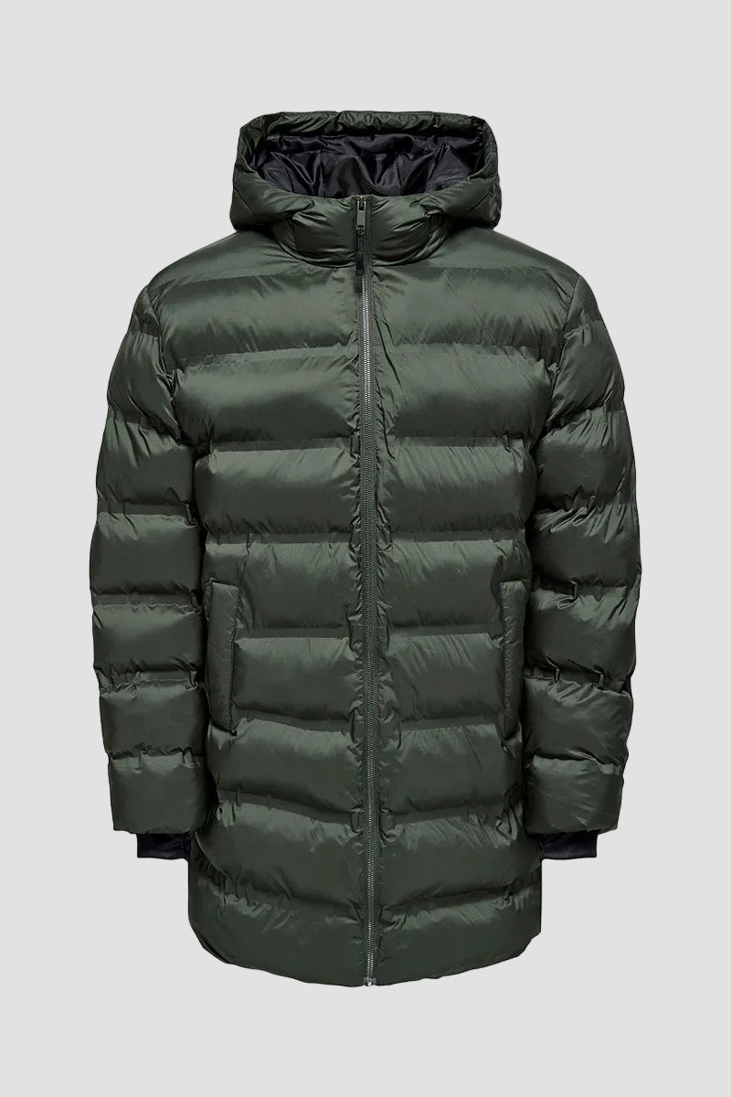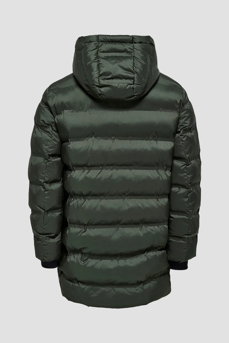 - Long puffer jacket with high collar