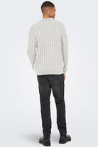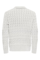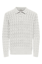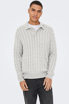 - The sweater features a knitted collar and 3 buttons at the top. It also has ribbing at the hem and sleeves