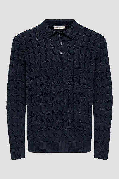- The sweater features a knitted collar and 3 buttons at the top. It also has ribbing at the hem and sleeves