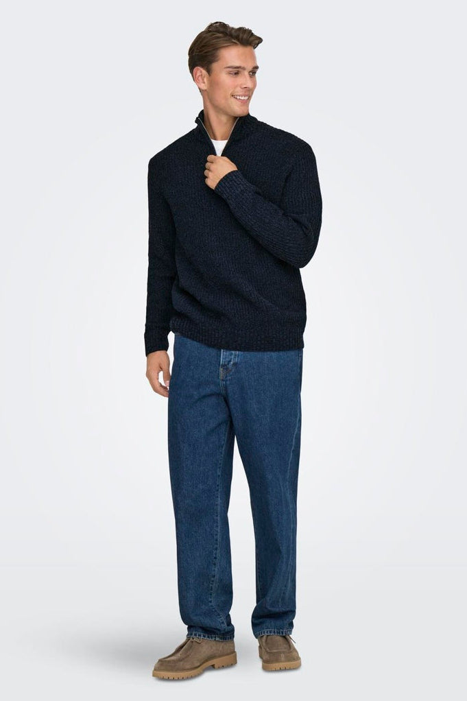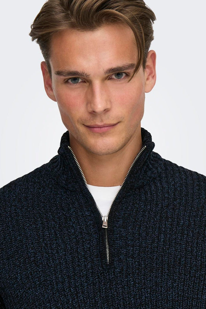 This regular fit knitted pullover features a crew neck and long sleeves, finished with a half zip fastening for easy wear. Its structure knit offers a stylish and clean appearance through a variety of patterns and textures, making it a comfortable and timeless choice for colder seasons or chilly evenings. Made with sustainability in mind, the main material includes at least 50% recycled polyester, blending responsible production with quality.