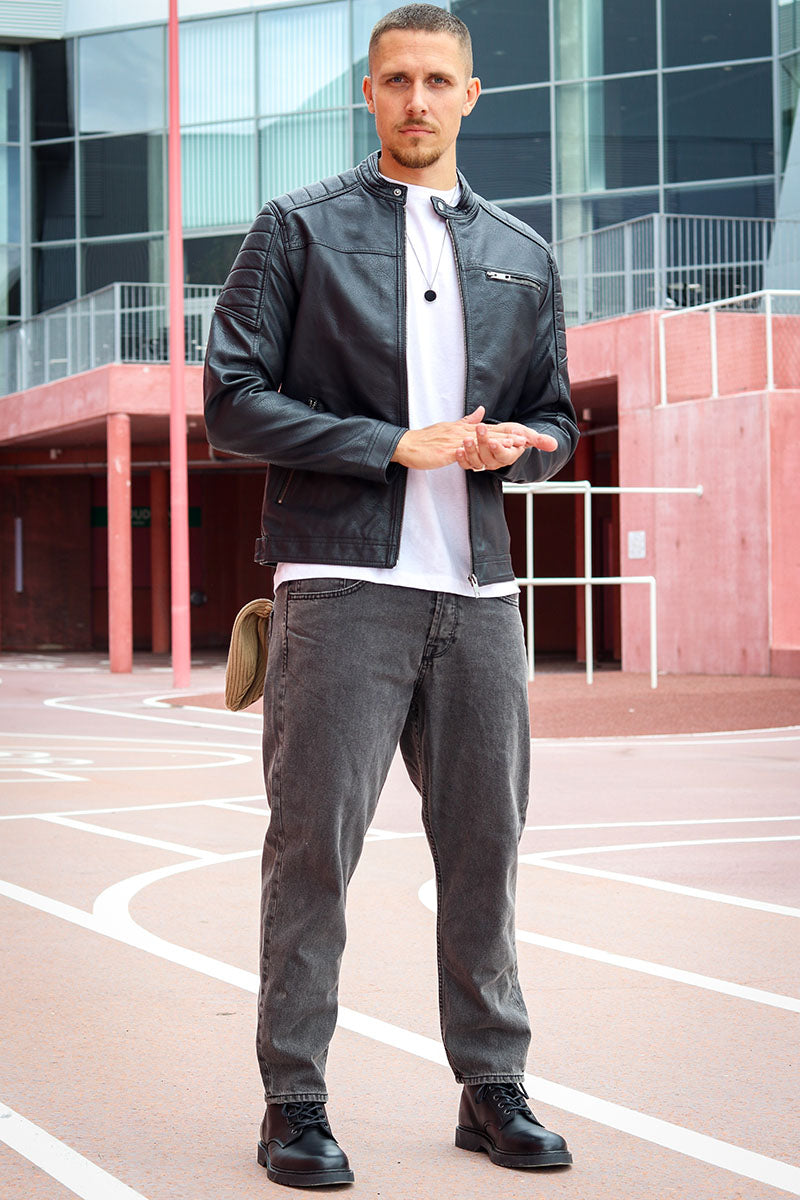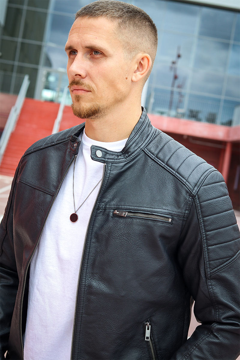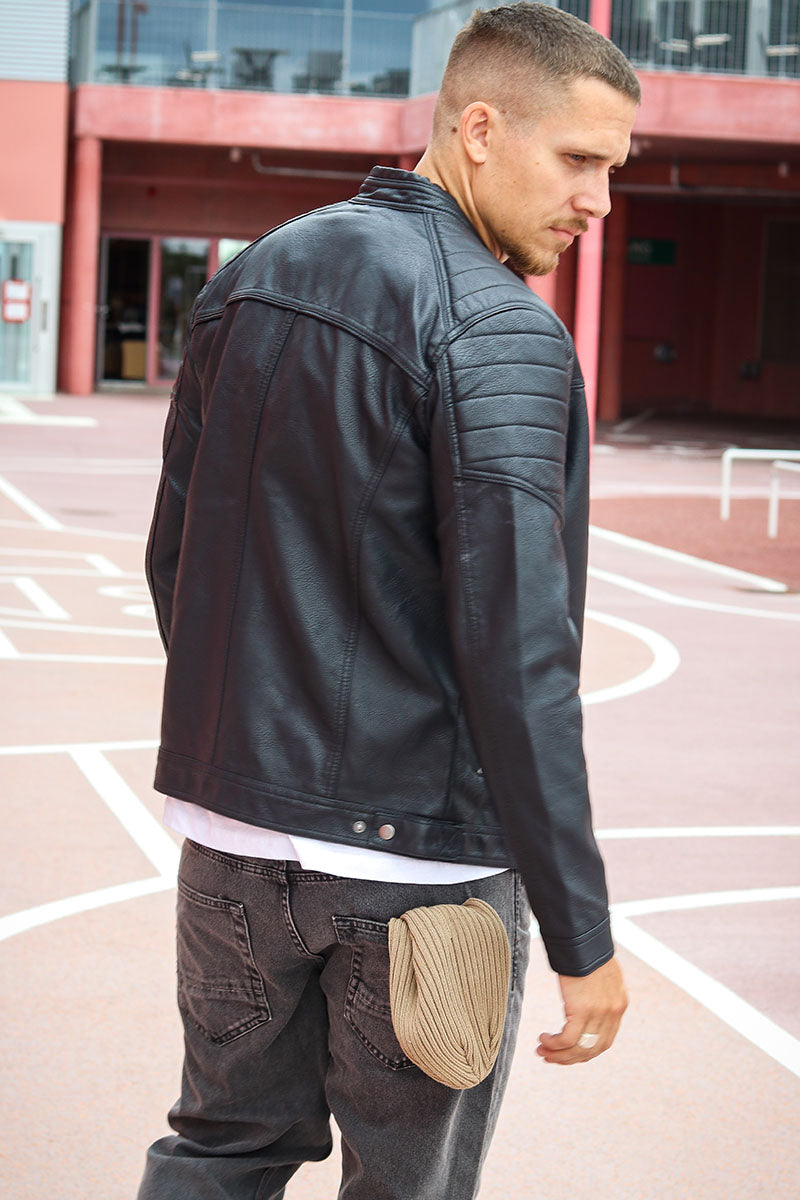 This jacket offers a sleek and casual style perfect for everyday wear. It features long sleeves and a biker collar, complemented by a zip fastening for easy use. The quilted detail adds subtle texture, while the black color with a polyurethane coating gives it a smooth finish that stands out in the autumn season.