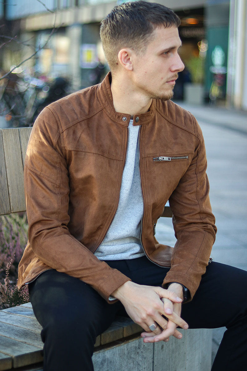 This jacket is designed with a biker collar and long sleeves, perfect for casual everyday wear. Made from 100% polyester coated with polyurethane, it offers the look and durability of synthetic suede while being easy to maintain. The jacket features quilted detailing, adding some texture and style to a classic outerwear piece. It closes with a zip fastening and includes side and chest pockets, both equipped with zippers for secure storage.