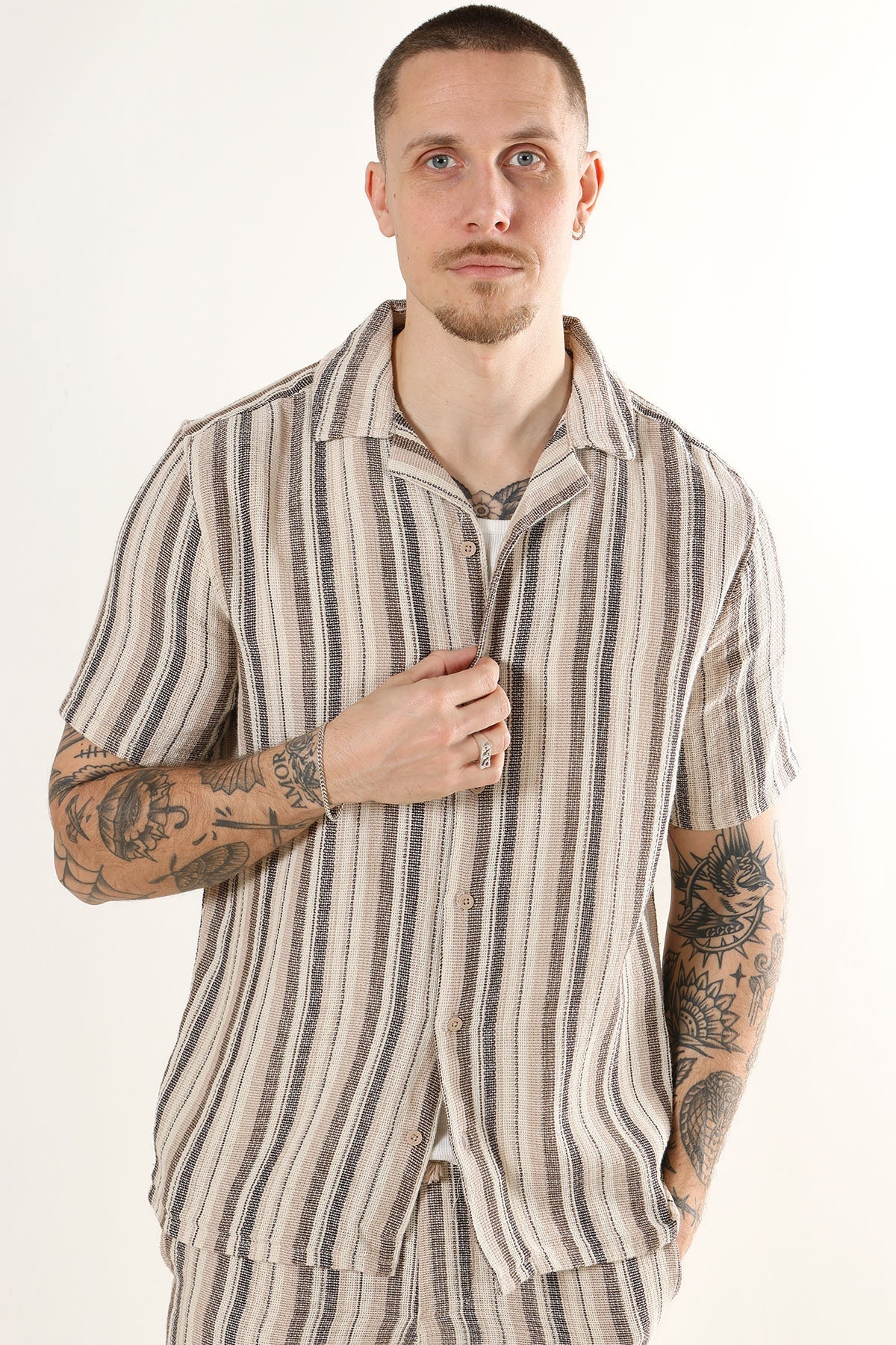 This striped shirt offers a relaxed, regular fit with short sleeves and a resort collar, making it a versatile choice for everyday wear at school or work. Crafted from a blend of recycled polyester, cotton, and recycled cotton, it provides both comfort and sustainability in a soft gardenia tone.