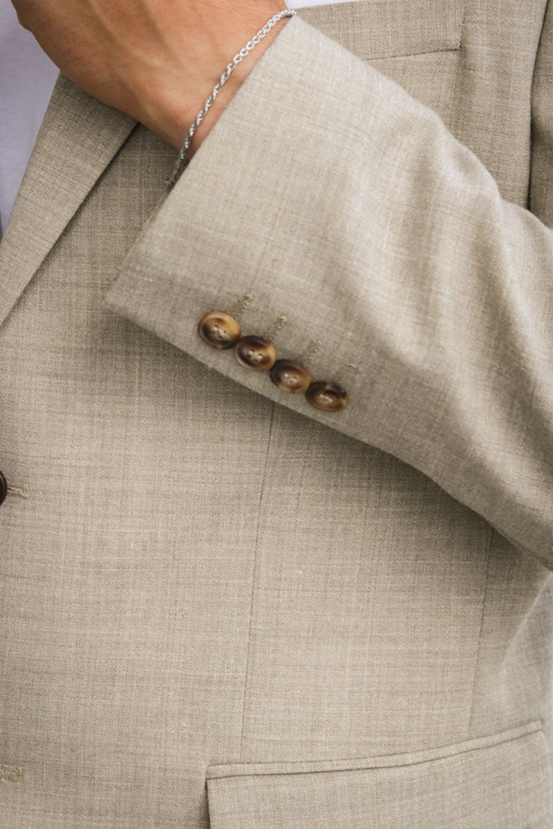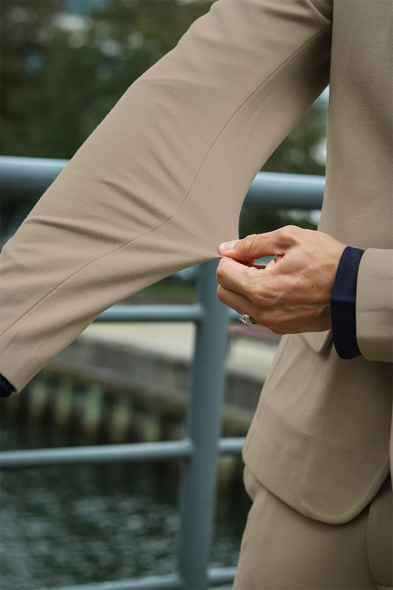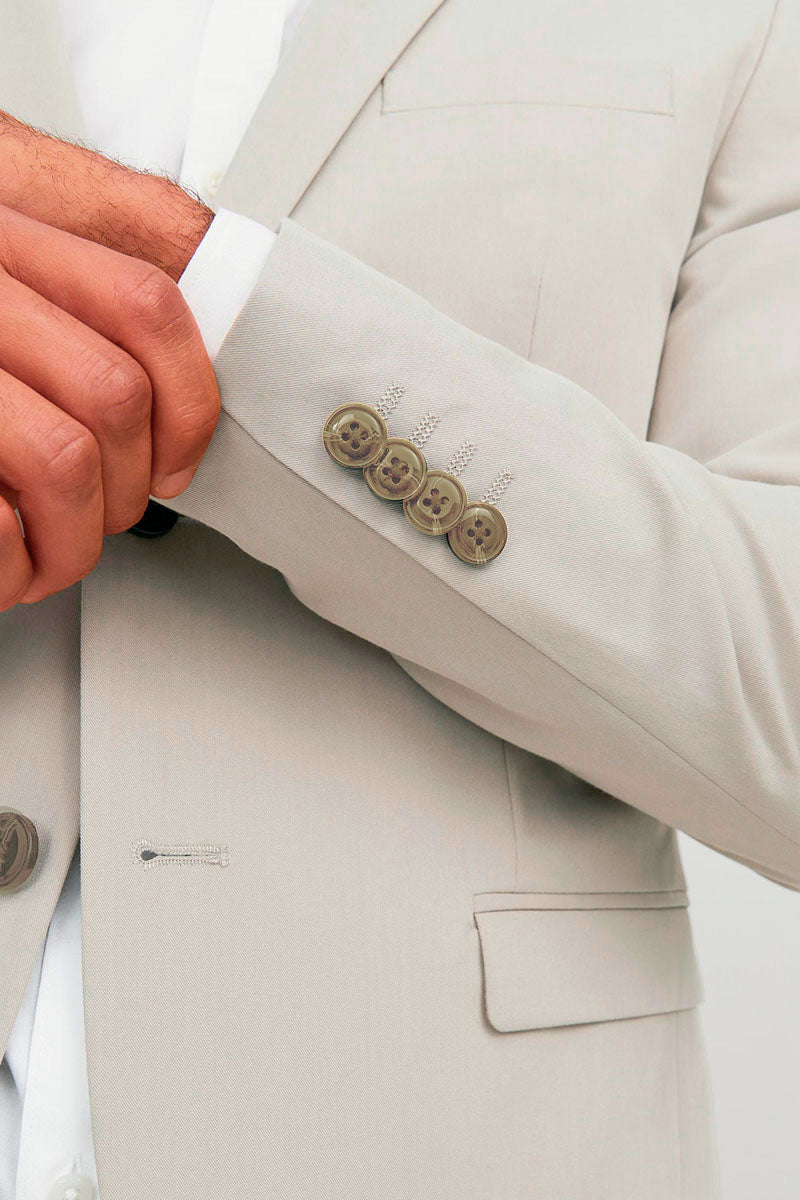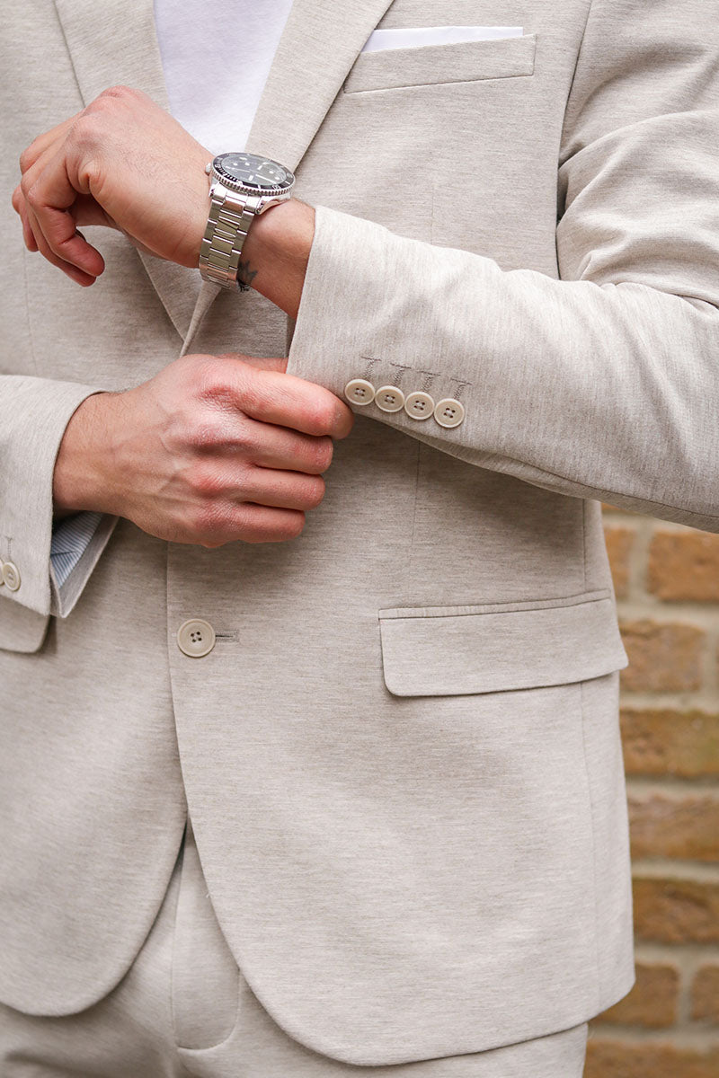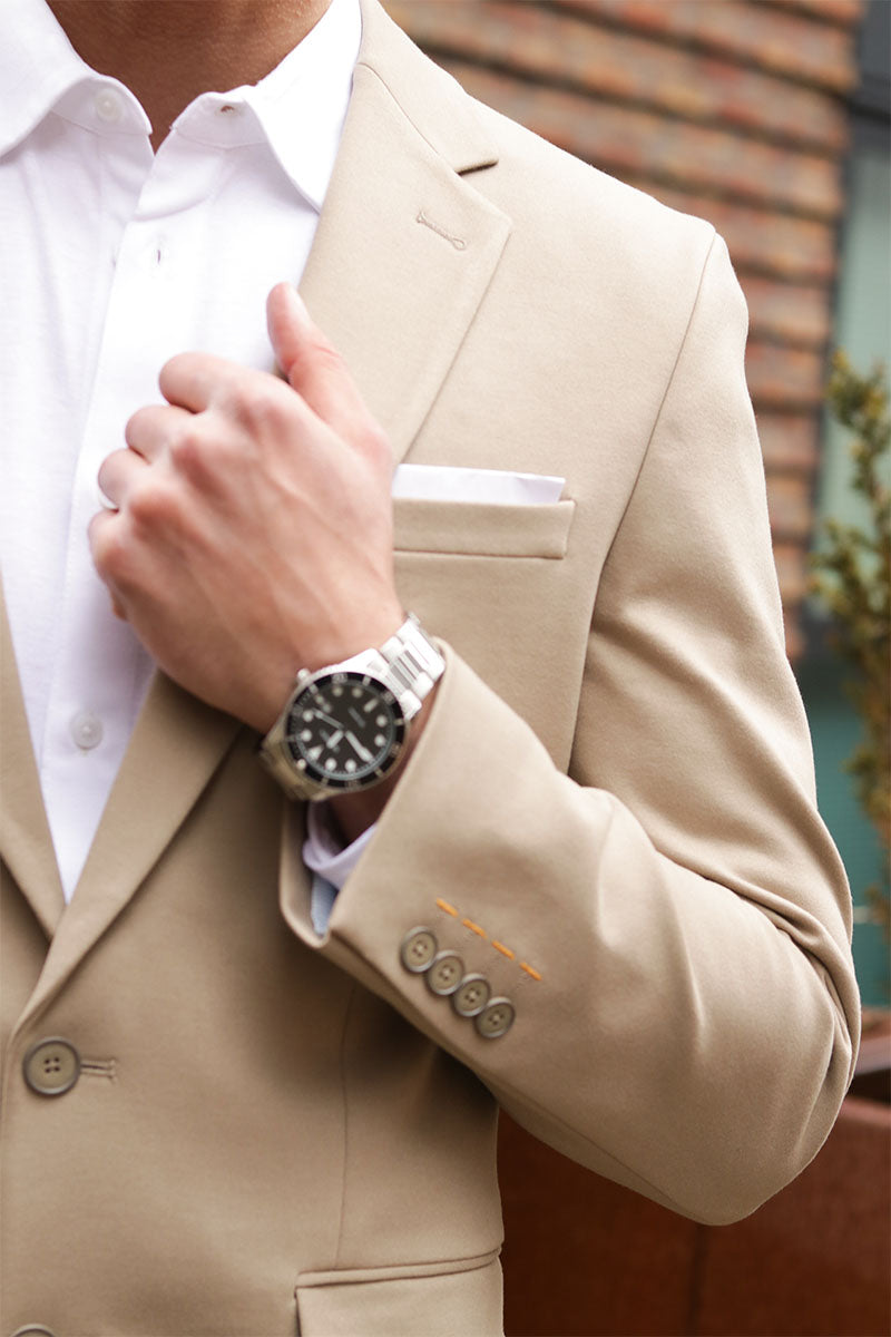 2. Fit: Pick a suit that fits your body, and let the sleeve stop at your wrist.