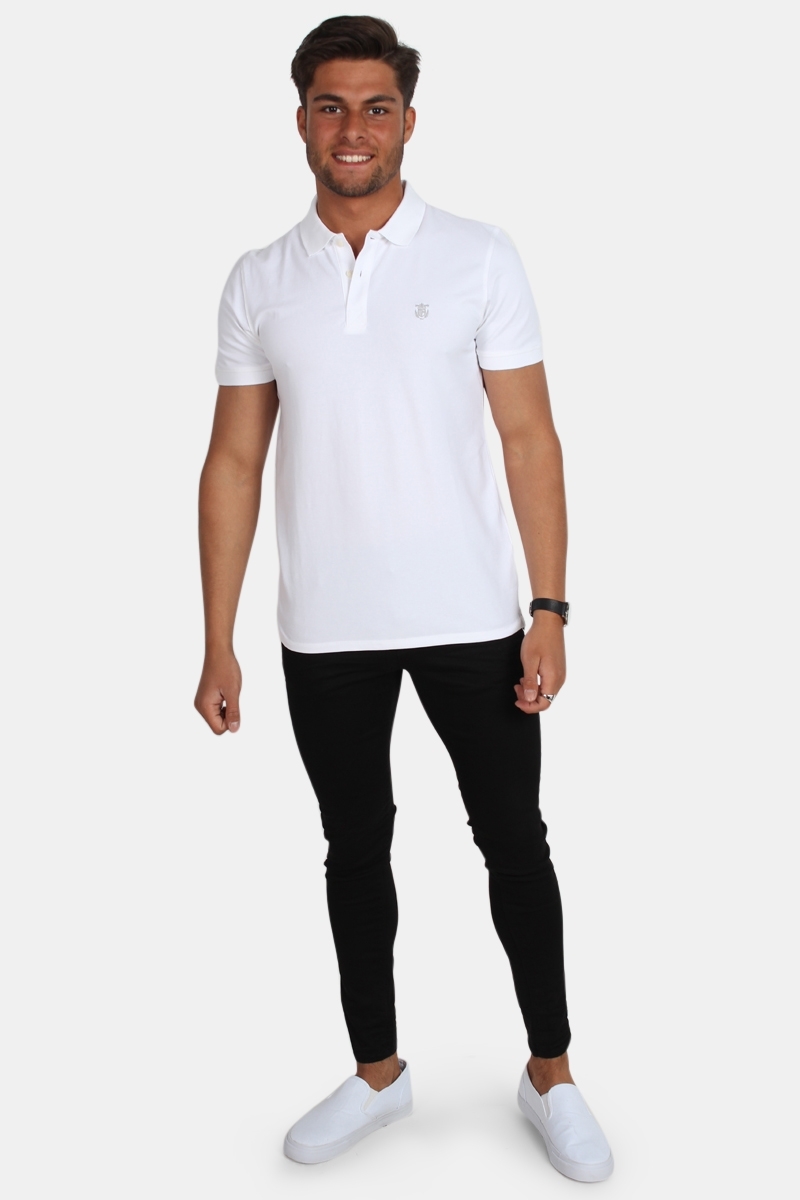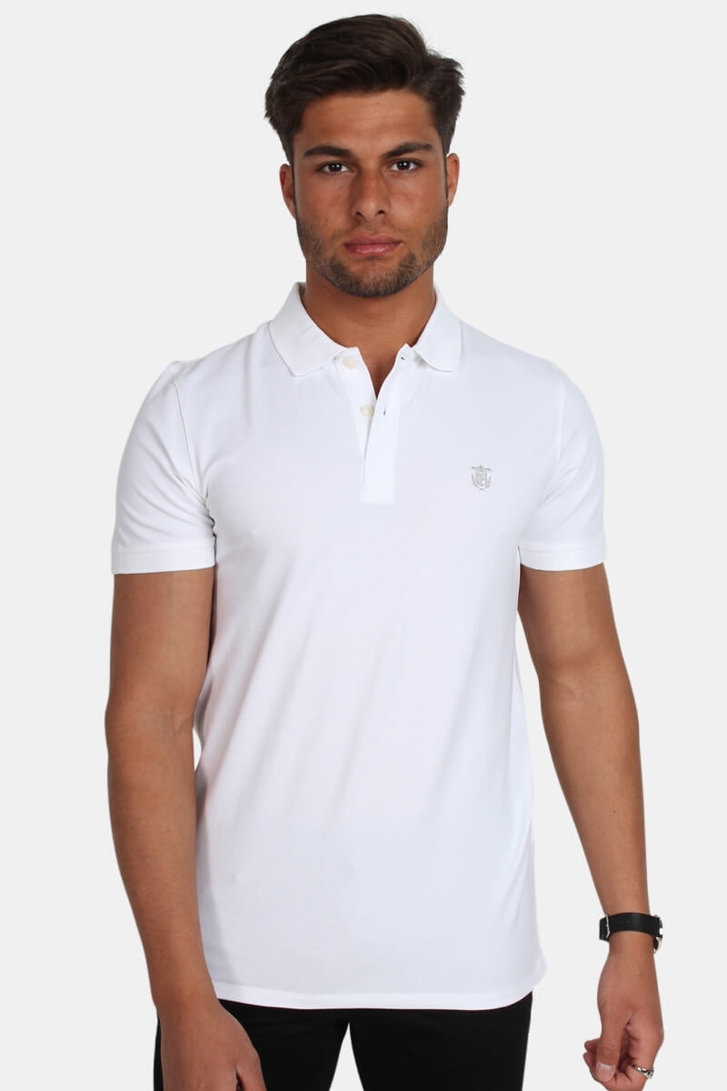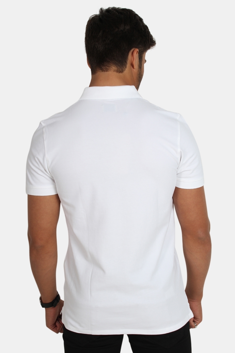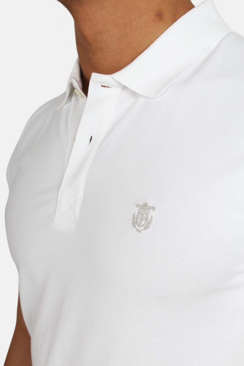Smart polo from Selected in a great white color. Embroidered logo in gray on front of this product. Buttons are in white, and is very much like the color of the polo. This product has short sleeves. Quality: 95% cotton and 5% spandex